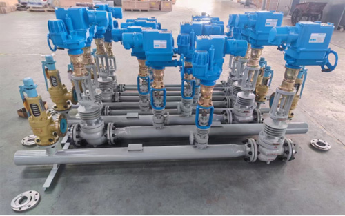 產品特點: 1、減溫減壓裝置主要包括:減壓系統(電/氣動減壓調節閥);減溫系統(主汽管體、電氣動給水調節閥、節流閥、止回閥、截止閥);安全保護系統組成; 2、采用減溫、減壓分體閥結構,使蒸汽先減壓;然后單獨減溫,分別在不同系統內完成,該裝置的長度提高了運行的可靠性,便于壓力、溫度的獨立調節; 3、減壓系統:由減壓閥和節流孔板組成,減壓閥通過通過改變流通面積達到調節壓力的目的; 4、減溫系統:通過高壓差調節閥,將冷卻水從噴嘴處以霧狀噴入蒸汽管道的蒸汽中,使蒸汽溫度降低; 5、主汽管體:有蒸汽管和混合管組成,根據用戶提供的參數決定,是減溫減壓裝置的主體設備,目的是將減溫減壓后的蒸汽送入用戶需要的管道上; 6、安全保護系統:為防止二次蒸汽壓力超過規定的值,起到安全保護的作用,根據不同參數選用滿足工況要求的安全閥; 7、熱力控制系統:通過接受出口溫度、壓力信號,經過信息處理,實現自動調節。
